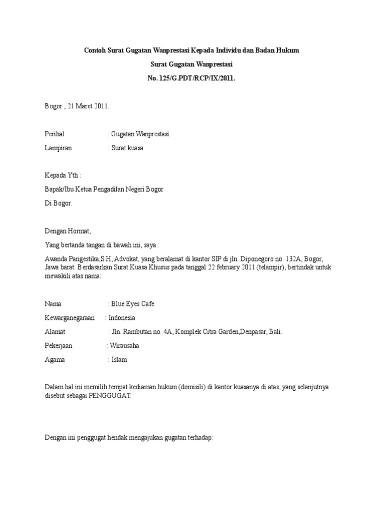 Contoh Surat Gugatan Wanprestasi Kepada Individu Dan Badan ...